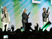 젠슨 황 엔비디아 최고경영자와 이재용 삼성전자 회장, 정의선 현대차그룹 회장이 30일 서울 코엑스에서 열린 엔비디아의 그래픽카드(GPU) ‘지포스’ 출시 25주년 행사 단상에 올라 퍼포먼스를 하고 있다. 연합뉴스